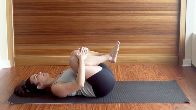 Lying on your back, bend your knees and bring them in toward your chest as you exhale. Wrap your hands around your knees while keeping your back flat. Hold for 30 seconds, focusing on your breathing.