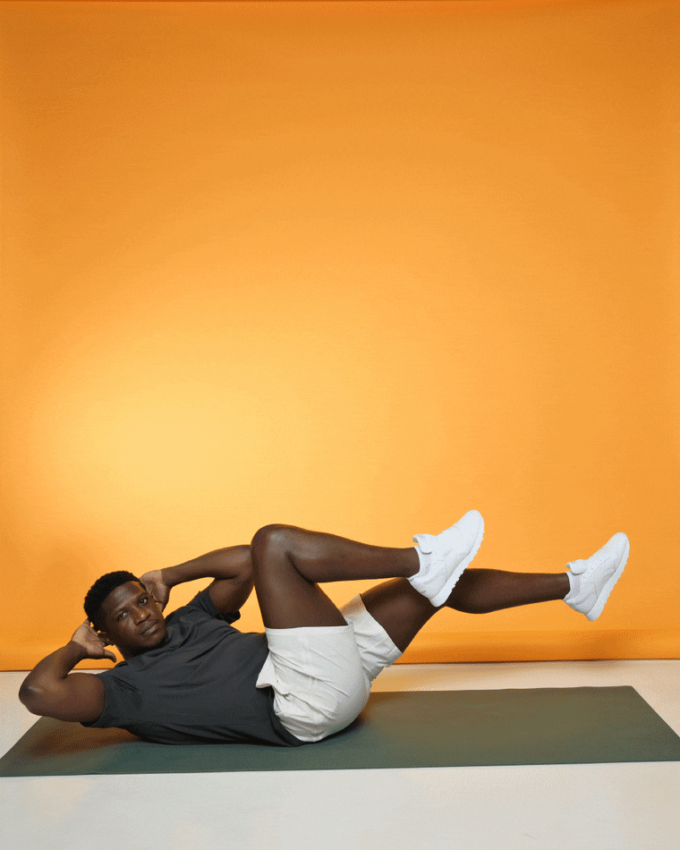 Start lying on your back with your hands behind your head. Slowly lift your shoulders off of the floor and bend your knees at a 90-degree angle, looking at your thighs. Squeeze your abs while you reach your right elbow toward your left knee while straightening your right leg. Move through center and then reach your left elbow toward your right knee, straightening the left leg. Alternate for about 30 seconds.